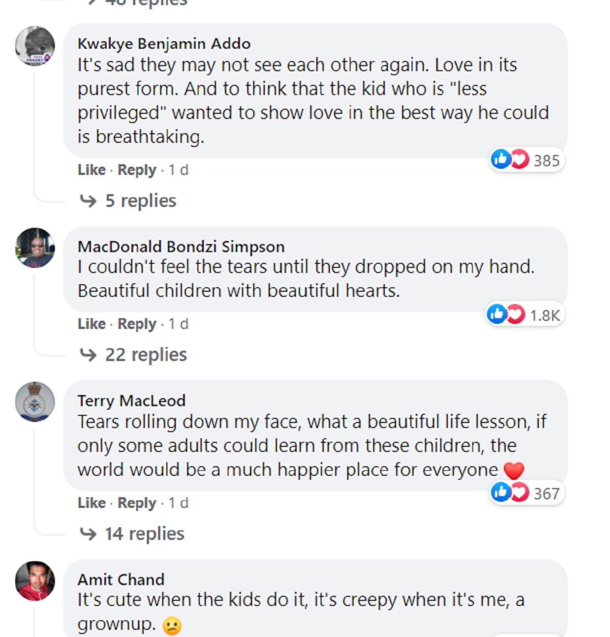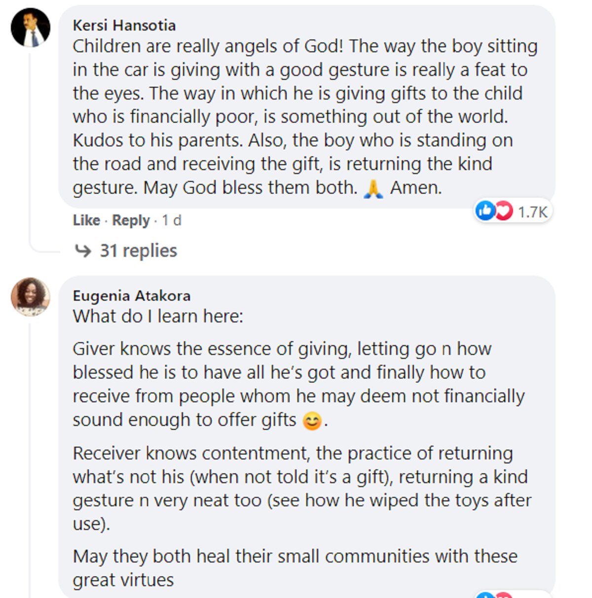 “What do I learn here: Giver knows the essence of giving, letting go n how blessed he is to have all he’s got and finally how to receive from people whom he may deem not financially sound enough to offer gifts . Receiver knows contentment, the practice of returning what’s not his (when not told it’s a gift), returning a kind gesture n very neat too (see how he wiped the toys after use). May they both heal their small communities with these great virtue (sic),” one other remark learn.