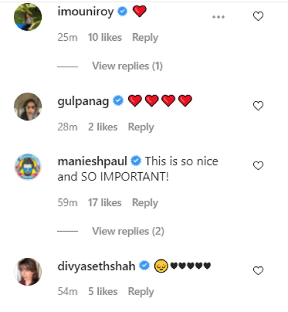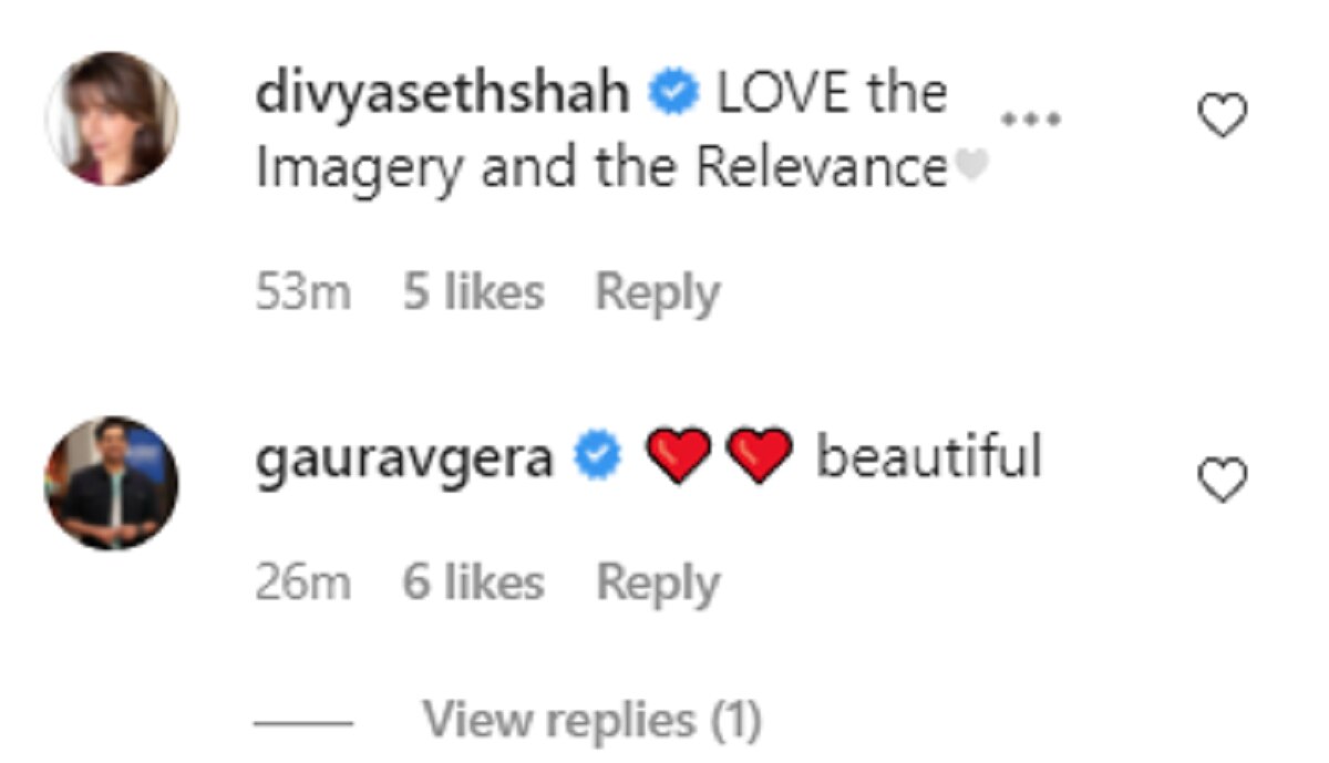 Maniesh Paul, Divya Seth and others have commented on the submit. “This is so nice and SO IMPORTANT (sic),” Maniesh wrote. “LOVE the Imagery and the Relevance (sic),” Divya Seth wrote.